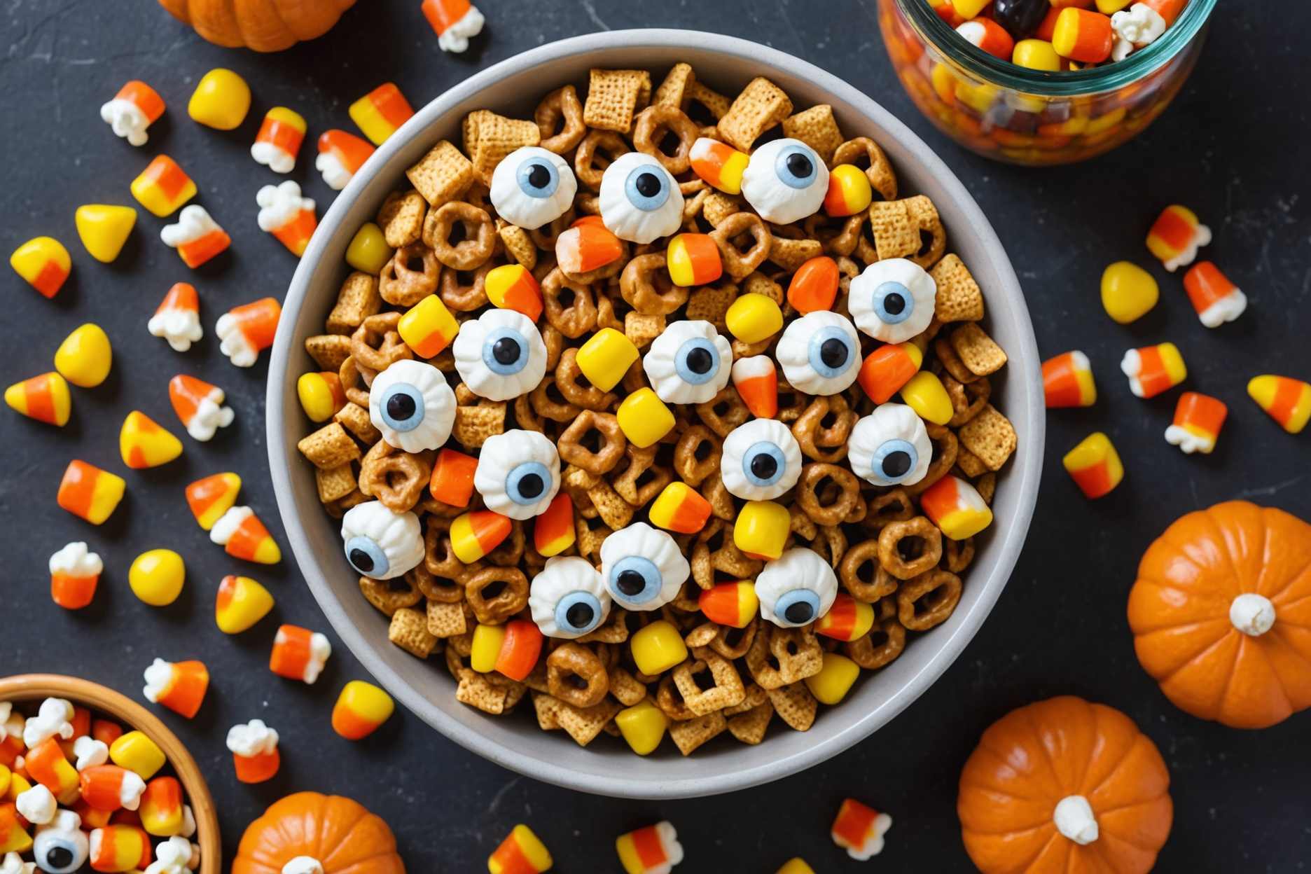 Savory cheese crackers, popcorn, and pretzel sticks are coated in sweet syrup, then mixed with creepy candy eyeballs, peanut butter pieces, and candy corn in this festive Halloween snack mix, perfect for all ages!