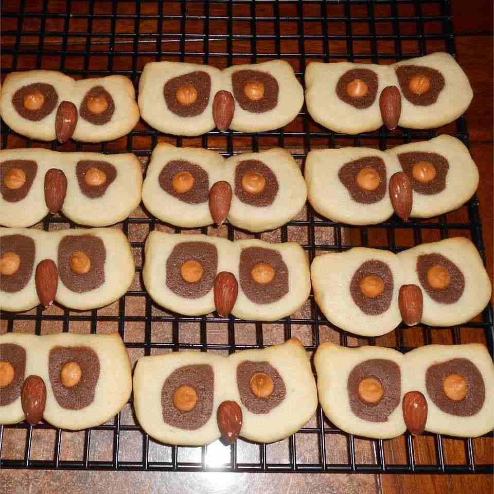 - Step 3:Cut dough into 1/8 inch slices with a sharp knife. Place two slices side by side on a cookie sheet to resemble an owl's face. Pinch upper "corners" to resemble ears. Put chocolate chips in each dark circle for eyes and a cashew in the center for the beak.