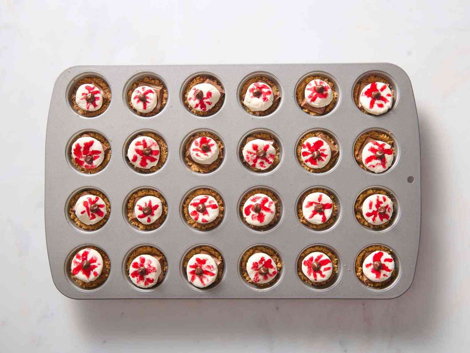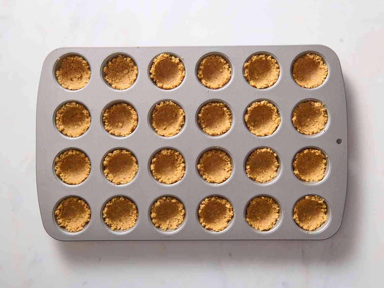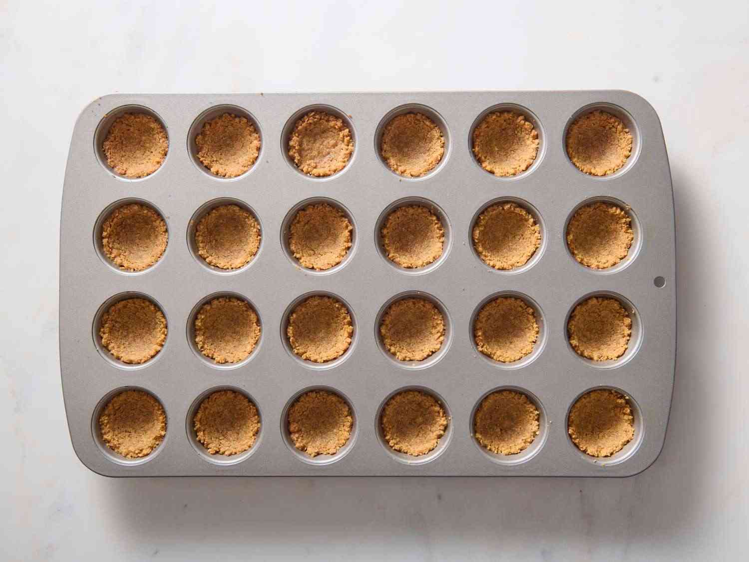 - Step 2:Stir graham cracker crumbs, butter, and confectioners' sugar together in a bowl; mix until evenly moistened and press into an ungreased mini-muffin pan to form shallow cups. Allrecipes/Julia Hartbeck